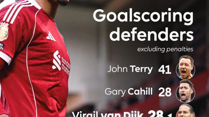 With his latest goal, the Liverpool captain has now moved level with Gary Cahill for the second-most goals scored by a defender in Premier League history.
